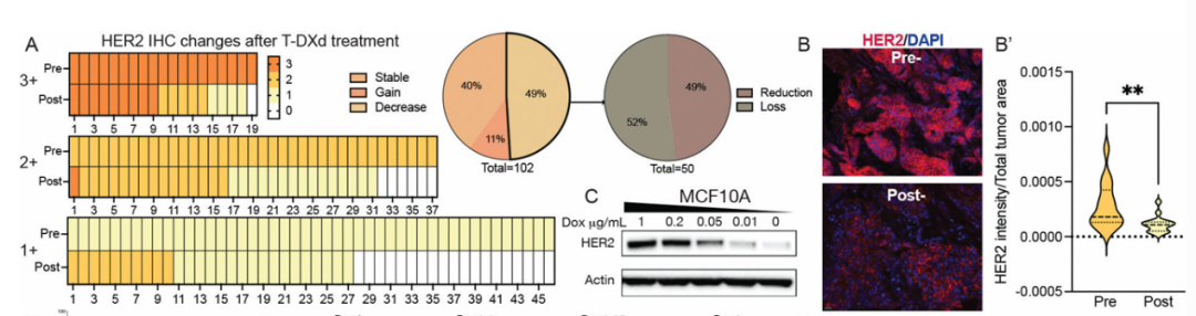 为了探究T-DXd治疗过程中HER2表达的真实变化,研究团队对102名接受标准T-DXd治疗、且拥有配对治疗前与进展后肿瘤样本的乳腺癌患者进行了回顾性分析。结果引人注目:49%的患者在疾病进展时,其肿瘤组织的HER2免疫组化(IHC)评分出现显著下降。在这些HER2下调的患者中,高达52%的病例出现了HER2表达的完全丧失(IHC评分降至0)。