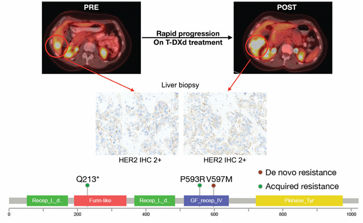 图3(顶部)显示了携带ERBB2 V597M突变且在T-DXd治疗中病情快速进展的患者的影像学和病理学数据。她在T-DXd治疗开始至两个月后的PET-CT检查显示已知肝脏病灶快速进展。(中部)HER2 IHC染色显示HER2表达无变化。(底部)Lolliplot图显示P593R和V597M突变位于曲妥珠单抗结合区域之一,Q213*突变位于类富林半胱氨酸丰富区。