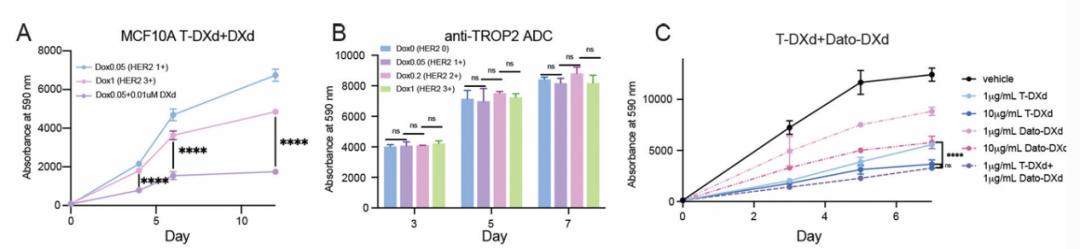 (C)细胞生长曲线显示了T-DXd、Dato-DXd及其组合在0.2μg/mL多西环素诱导的MCF10A HER2 OE细胞中的作用。数据表示为平均值±SD,n=3。显示了1μg/mL T-DXd+1μg/mL Dato-DXd与10μg/mL T-DXd或10μg/mL Dato-DXd组合之间最终时间点(第7天)的P值。P<0.0001;ns,不显著(P>0.05)。