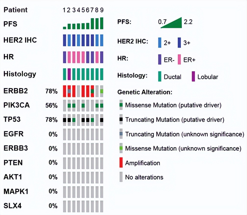图2对于9名HER2阳性转移性乳腺癌(MBC)且对T-DXd迅速出现进展(无进展生存期<3个月)的患者,其临床基因组数据如图肿瘤印记图所示,每一列代表不同的患者。发现两名患者存在值得关注的ERBB2突变:患者#2具有Q213突变,患者#9具有V597M不明意义变异(VUS)。未发现EGFR、ERBB3、PTEN、AKT1、MAPK1或SLX4的突变。