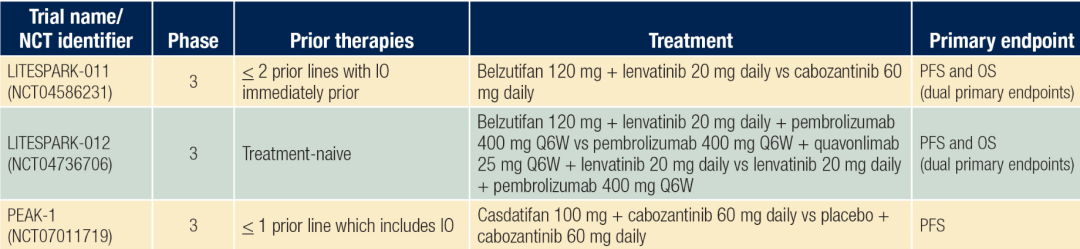 LITESPARK-011研究:这是一项正在进行的随机III期研究,针对既往接受过至多2种疗法(含免疫治疗)的mccRCC患者,旨在对比贝组替凡联合仑伐替尼和卡博替尼单药治疗。2025年10月发布的新闻稿表明,联合疗法在PFS上实现统计学意义的显著改善。