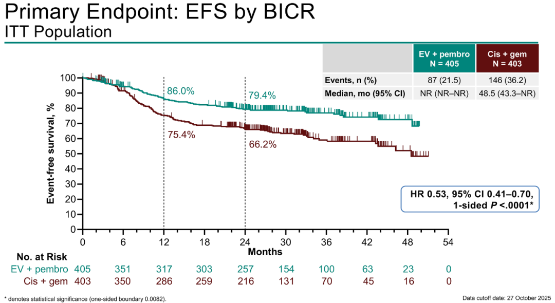 KEYNOTE-B15是首个直接比较非铂类化疗方案与铂类化疗方案疗效的III期临床研究,其结果在近期举行的ASCOGU2026年会公布,研究数据显示,在MIBC患者中,根治性膀胱切除术前后联合使用维恩妥尤单抗和帕博利珠单抗,较吉西他滨联合顺铂化疗后行膀胱切除术显著改善了患者疗效。独立中心盲法审查评估表明,维恩妥尤单抗联合帕博利珠单抗组的主要终点无事件生存期(EFS)优于吉西他滨联合顺铂组(试验组的中位EFS尚未达到,而化疗组为48.5个月,HR=0.53,95%CI 0.41-0.70;P<0.0001)。