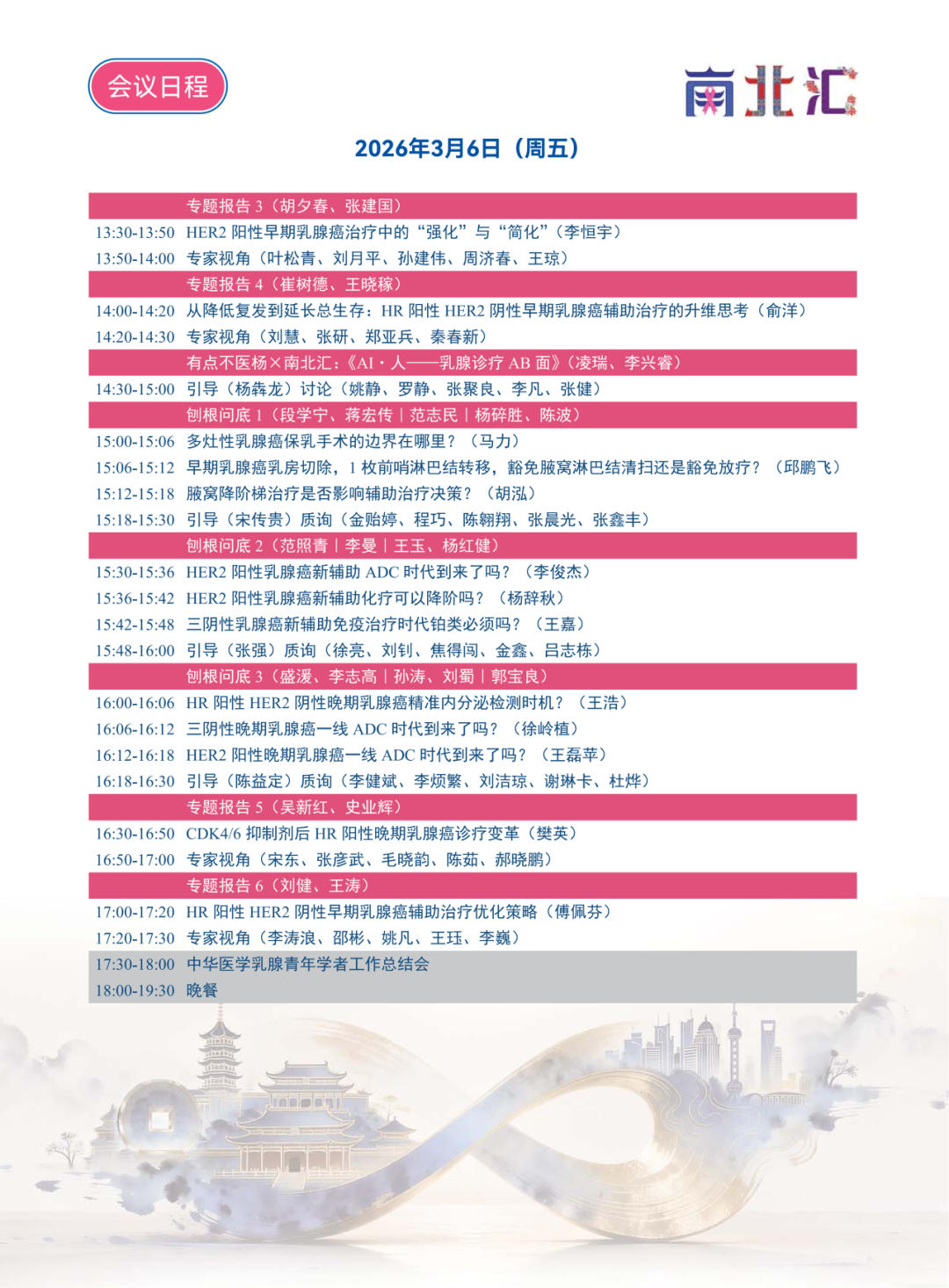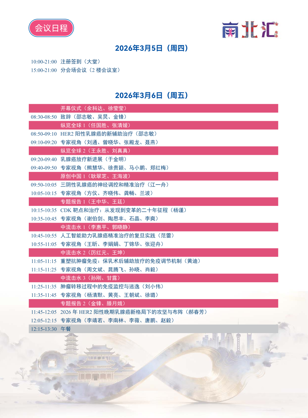 第八届“南北汇”将于2026年3月5日至7日在沈阳举行。本届论坛将继续延续历届会议的优良传统,并在新的起点上进一步拓展:我们将精准把握国际前沿动态,深入展示中国原创研究成果,多维度剖析临床实践中的热点与难点,同时持续关注青年人才的成长与发展。立足国际视野,结合中国实际,清晰呈现乳腺肿瘤诊治领域的发展脉络与临床新格局。
