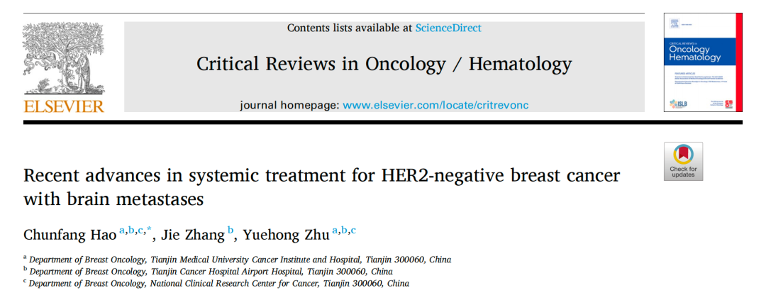 近期,天津医科大学肿瘤医院郝春芳教授团队的一篇系统综述《Recent advances in systemic treatment for HER2-negative breast cancer with brain metastases》于国际知名学术期刊《Critical Reviews in Oncology/Hematology》正式发表。该研究聚焦HER2阴性乳腺癌脑转移及软脑膜转移这一临床“极寒之地”,全面梳理了新型系统治疗的作用机制、循证医学证据、适用人群与疗效边界。