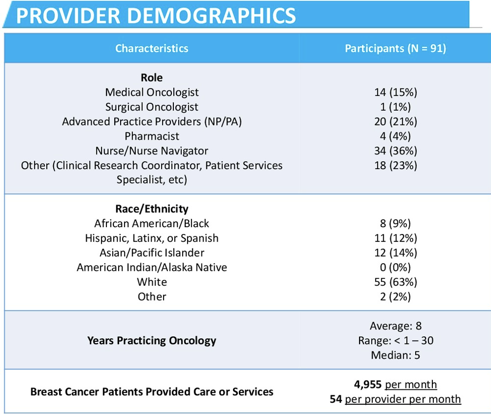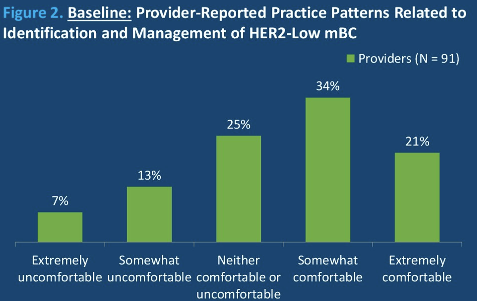 从2024年11月至2025年4月,来自7家社区肿瘤诊所的91名医护人员(HCPs)完成了基线调查,评估了与HER2检测、与病理科医生合作以及mBC患者治疗选择相关的实践模式、障碍和促进因素。随后,各诊所参与了审核与反馈会议,以审查各自机构的具体数据,识别实践差距的根本原因,并制定行动计划。各诊所代表之后再次开会,审查目标进展,解决持续存在的挑战,并完善行动计划。收集了后续调查以评估实践的持续变化。