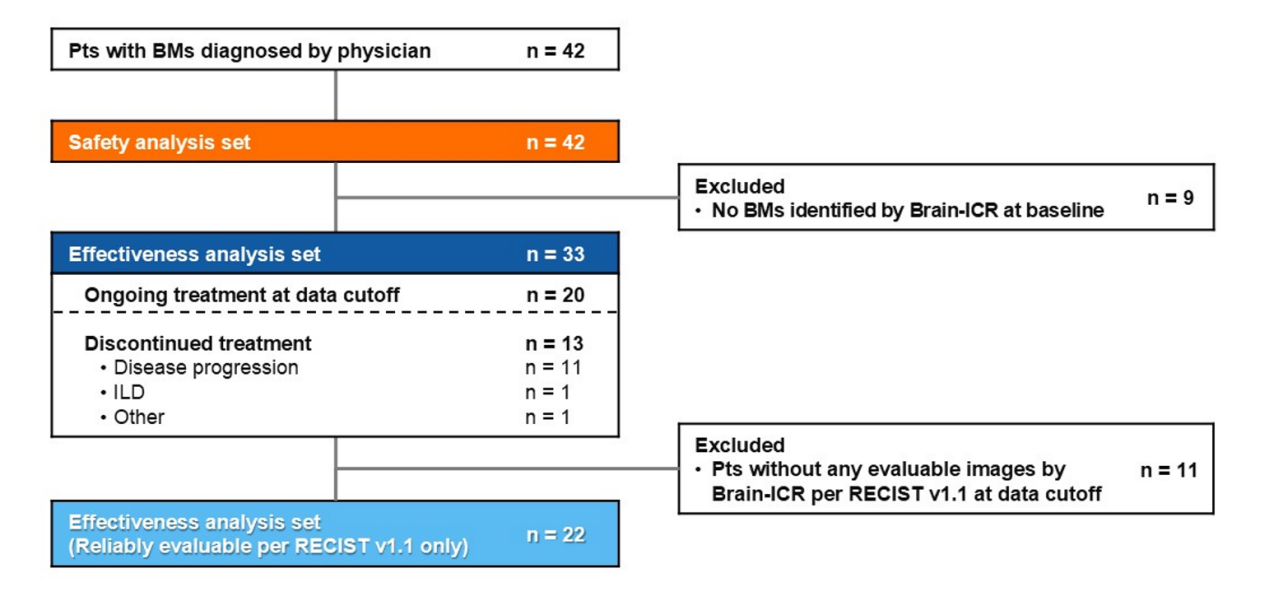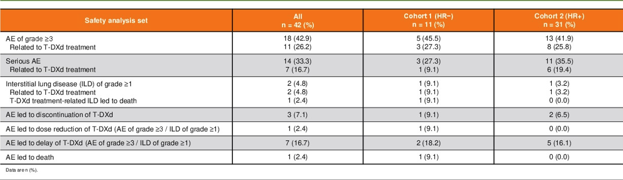 中位OS未达到,6个月生存率为77.1%(95%CI:51.5-90.3)。在安全性分析集(n=42;中位随访期:4.1个月[范围:0.4-12.6])中,≥3级不良事件和与T-DXd治疗相关的≥3级不良事件分别发生18例(43%)和11例(26%)。≥1级间质性肺病发生2例(5%),其中1例(2%)为5级间质性肺病。导致T-DXd中断的≥1级不良事件发生3例(7%),其中两例为间质性肺病,另一例为癫痫发作。