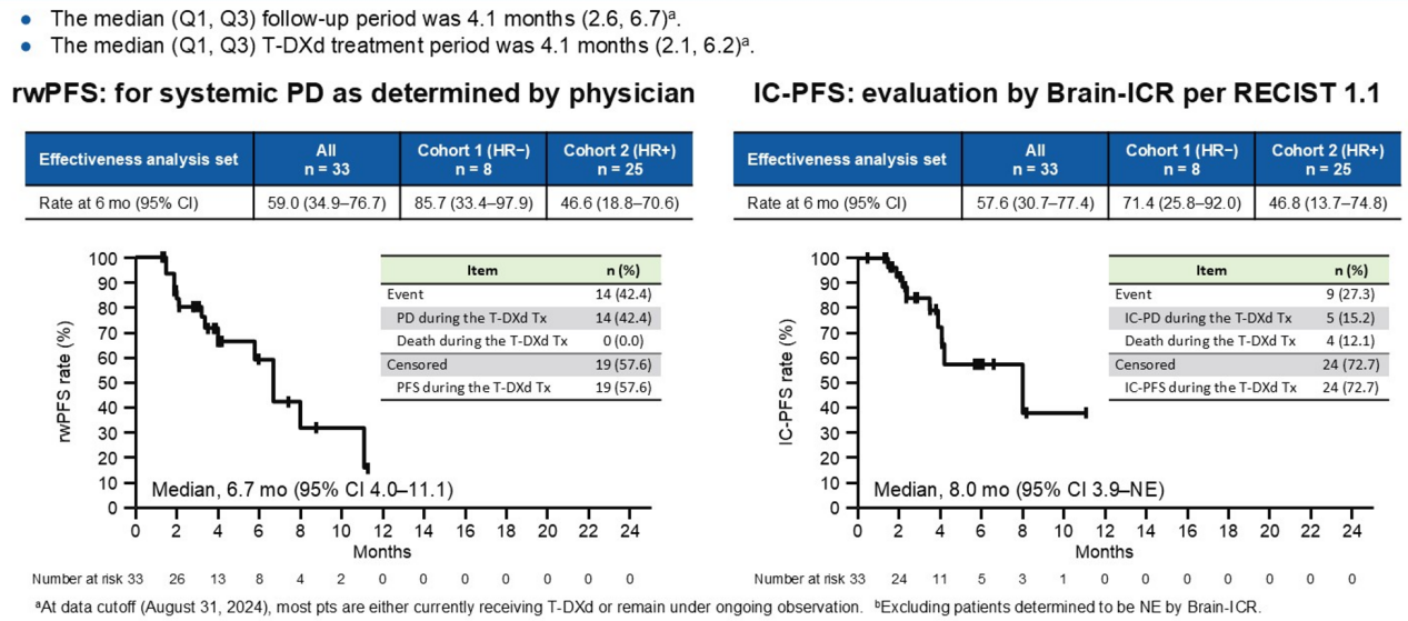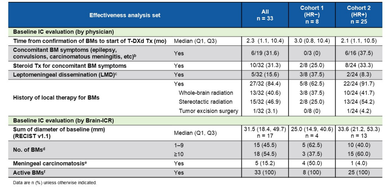 自2023年6月起,该研究纳入了600例既往诊断为HER2低表达的转移性乳腺癌(队列1:HR-/HER2低表达患者200例;队列2:HR+/HER2低表达患者400例,包括活动性脑转移)、既往接受过化疗并计划接受T-DXd治疗的患者。本次期中分析纳入了由当地研究者诊断伴有脑转移(当前或既往)的患者。伴脑转移患者期中分析数据截止日期为2024年8月31日,总人群随访计划将持续至2026年7月。主要终点包括有效性、安全性和QOL评估。有效性指标包括:OS(总生存)、PFS(无进展生存期)、ORR(客观缓解率)等。脑转移患者的有效性指标包括:IC-PFS(颅内无进展生存期),IC-ORR(颅内客观缓解率),IC-CBR(颅内临床获益率)、MDASI-BT(生活质量)。安全性包括:≥3级不良事件(AEs),≥1级间质性肺疾病(ILD),严重AE,导致T-DXd停药/减量/延迟治疗的AE以及死亡。生活质量评估包括:EORTCQLQ-C30、QLQ-BR45量表评估。