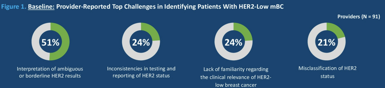 结果显示,HCP识别HER2低表达mBC的主要挑战包括:模糊或临界HER2结果的解读(51%)、HER2检测和报告的不一致性(24%),以及对HER2低表达临床相关性的不熟悉(24%)。