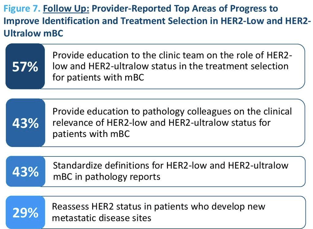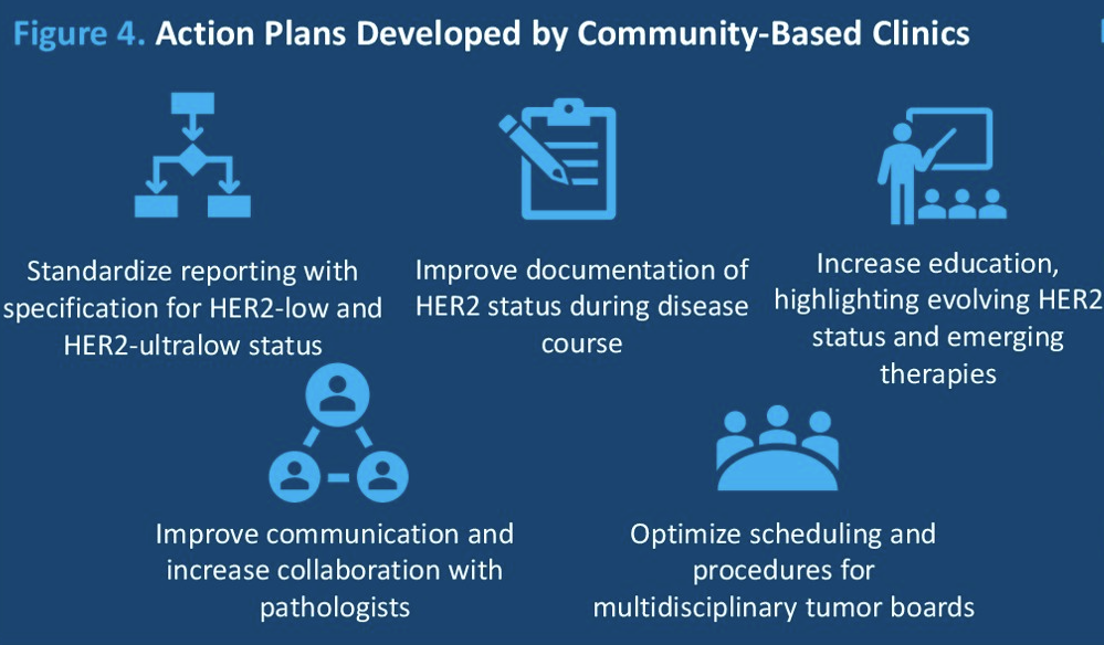 在治疗选择方面,HCP提到的主要挑战包括:跟进HER2低表达疾病患者的最新获批药物和指南更新(37%),以及为具有其他生物标志物靶向治疗选择的患者确定治疗顺序(36%)。这些发现为制定旨在标准化HER2结果报告、改善多学科沟通、整合MTB流程改进以及加强HCPs关于HER2低表达/超低表达mBC进展教育的行动计划提供了依据。社区诊所制定的行动计划包括标准化记录病理报告,明确HER2低表达和HER2超低表达状态的定义,完善疾病过程中HER2状态的记录,加强教育,强调HER2状态的演变和与治疗的关系,加强与病理科医师的沟通与合作,优化多学科肿瘤委员会的日程安排和流程等。