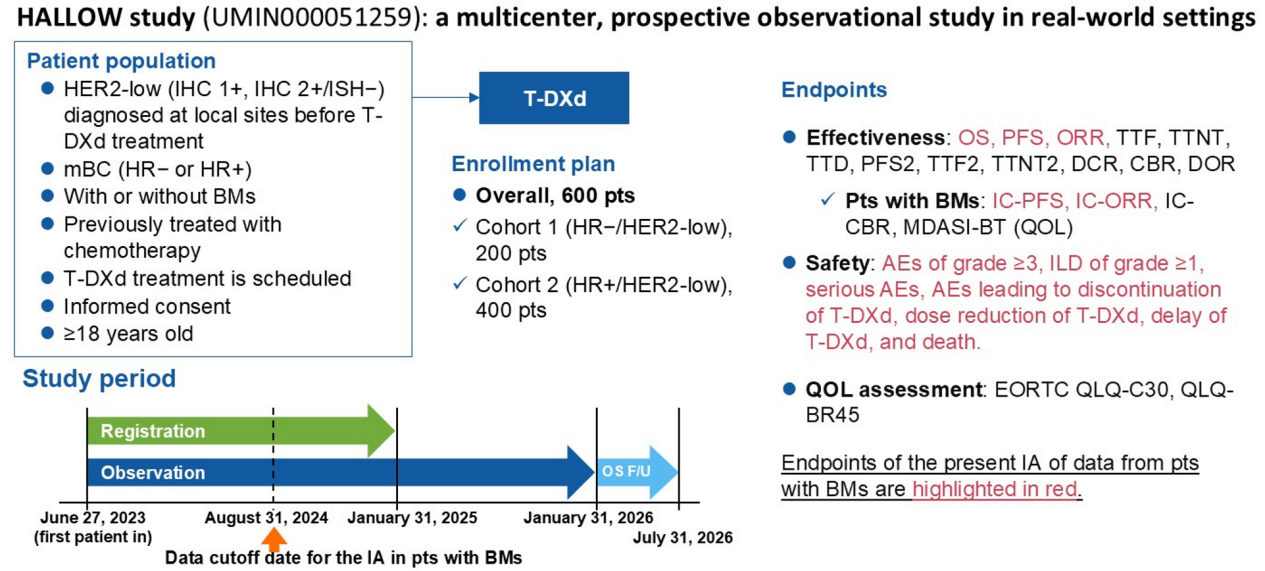 HALLOW研究(UMIN000051259)是一项在日本进行的大规模、前瞻性观察性研究,旨在通过探究T-DXd在既往接受过化疗的HER2低表达转移性乳腺癌(mBC)患者的有效性与安全性,补充DESTINY-Breast04(DB-04)研究数据与真实世界数据之间的差距。2025年SABCS大会上,Naoki Niikura教授介绍了HALLOW研究中伴有脑转移(BM)患者的期中分析(IA)结果。