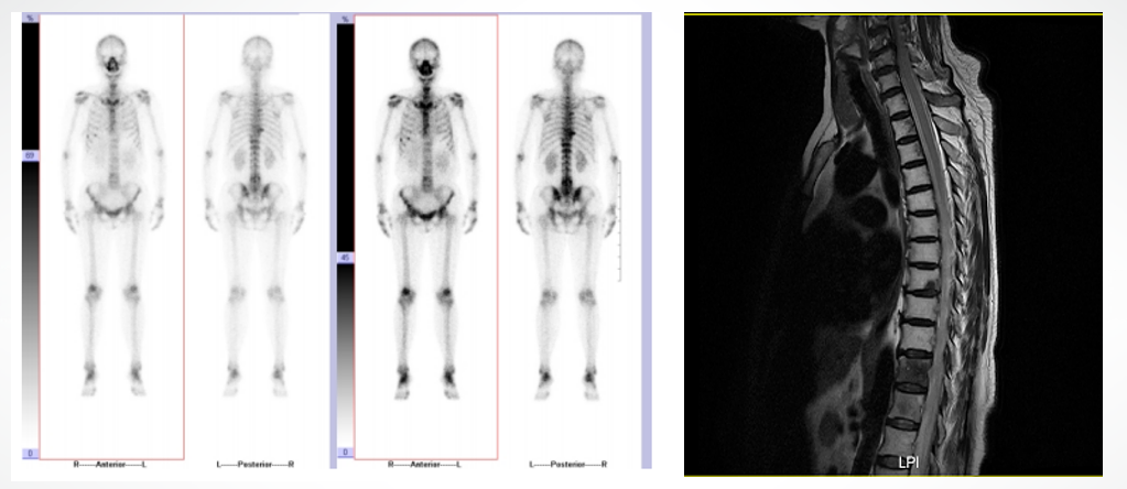 全身骨显像提示:全身多发骨转移性肿瘤。