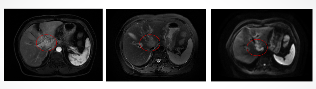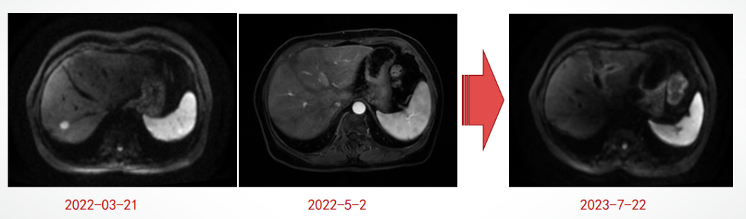 2023-10-12肝脏MR:肝多发转移瘤化疗后复查,较前片(2023-07-22)病变有增大,肝I段病变为著,累及肝门部结构。