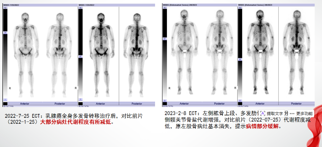 ECT显示:多发骨转移治疗后复查,多发肋骨、脊柱部分椎体骨盐代谢稍增强,对比前片(2025-3-18)程度有所减低;余部未见明确骨盐代谢增高灶。