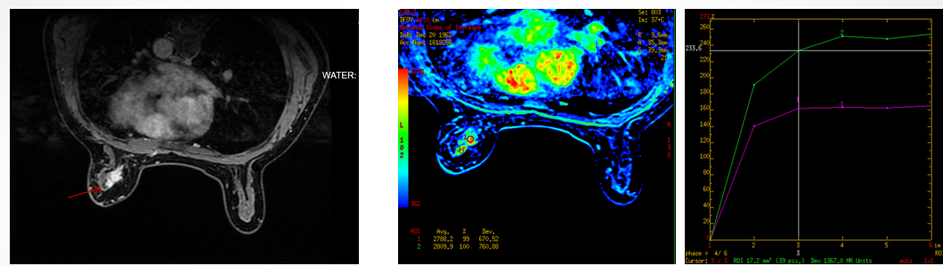 乳腺增强MRI示:左乳上象限见一肿块,大小约21.6mm*11.8mm,边界不光整、分叶,周围组织牵拉改变,DWI呈可见弥散受限改变,增强后肿块明显强化,乳头皮肤增厚、强化、回缩。注射造影剂后动态强化曲线呈II型(平台型)。