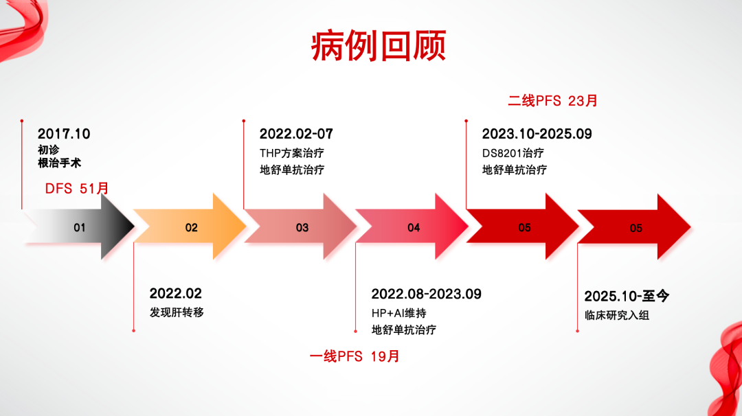 该患者为54岁女性,2017年10月因发现左乳肿块就诊,病理确诊为左乳浸润性癌(cT1N0M0 IA期,HR+/HER2-),接受左乳切除术并通过21基因检测后,患者接受TC方案辅助化疗并联合阿那曲唑内分泌治疗。2022年1月(DFS为51个月)出现肝、骨多发转移,穿刺病理提示分子分型转为HER2阳性;遂行一线治疗予以THP×6+地舒单抗治疗,后依西美坦+HP维持治疗。获肝转移CR、骨转移PR,PFS为19个月。2023年10月患者肝转移进展,进入二线治疗决策时,我们考虑到患者一线已接受曲帕双靶治疗,而DB-03研究中入组了62.1%的曲帕经治人群,证实了T-DXd在此类患者中具有显著的PFS和OS获益;相比之下,二线治疗的PHOEBE研究并未纳入曲帕经治人群,缺乏相应循证支持。因此,二线优选T-DXd靶向治疗,实现肝转移PR、骨转移SD,PFS为23个月。2025年9月肝转移再次进展,目前入组BAT1006联合治疗的II/III期临床研究。患者多线治疗后进展及时入组临床研究,也为后续治疗保留了更多可能性,符合晚期肿瘤“全程管理、持续获益”的治疗理念,为同类病例的诊疗提供了重要参考。