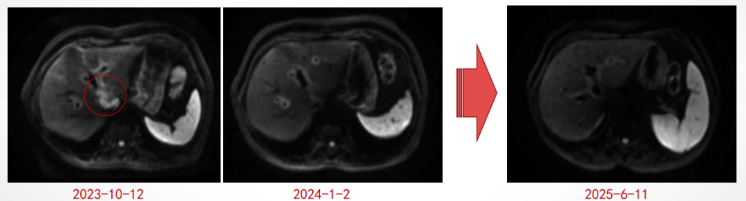 2025-9-9 MRI示:肝多发转移瘤化疗后复查,对比前片(2025-06-11)肝内病变进展,腹膜后淋巴结增大。
