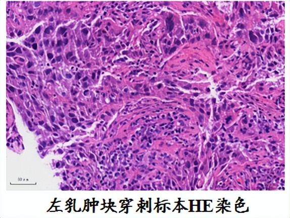 左乳肿块穿刺标本:非特殊类型浸润性乳腺癌,Nottingham组织学2级;