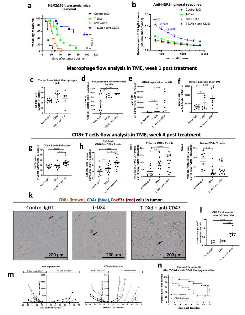 研究意外发现,Dxd在杀伤肿瘤的同时会上调肿瘤细胞表面CD47(“别吃我”信号)的表达,这可能是肿瘤抵抗免疫清除的自我保护机制。这一发现提示,CD47介导的免疫逃逸通路可能是限制T-Dxd诱导的免疫应答的潜在瓶颈。在临床前小鼠模型中,使用T-Dxd联合抗CD47抗体展现了协同抗肿瘤效应,联合治疗组肿瘤微环境中巨噬细胞吞噬功能增强、CD8+T细胞浸润增加。该结果为深入理解肿瘤细胞如何适应T-Dxd的免疫压力提供了关键线索,并为后续探索基于T-Dxd的联合治疗策略指明了方向。