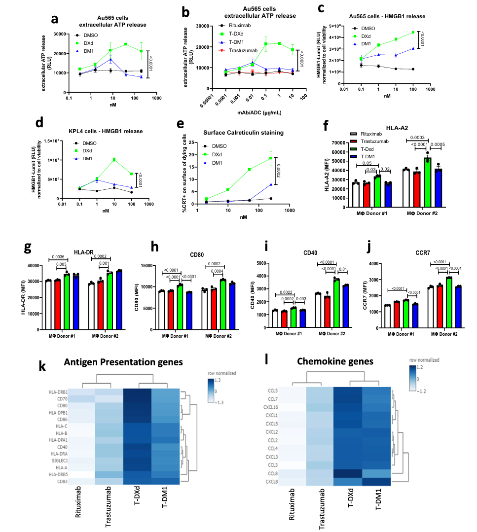 1)Dxd诱导强效免疫原性细胞死亡:与T-DM1的载荷DM1相比,Dxd处理的肿瘤细胞释放更多“危险信号”(ATP、HMGB1)并将钙网蛋白转移至细胞表面,更有效地招募和激活巨噬细胞、树突状细胞。活化后的髓系细胞高表达MHC分子及共刺激分子(CD40、CD80),抗原呈递能力显著增强。