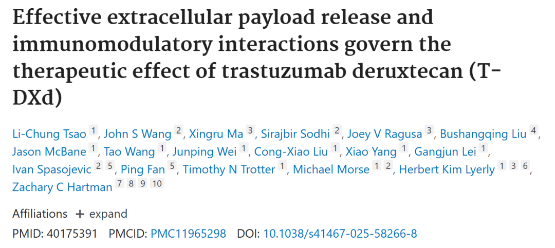 Tsao LC,Wang JS,Ma X,et al.Effective extracellular payload release and immunomodulatory interactions govern the therapeutic effect of trastuzumab deruxtecan(T-Dxd).Nat Commun.2025;16:3167.doi:10.1038/s41467-025-58266-8.