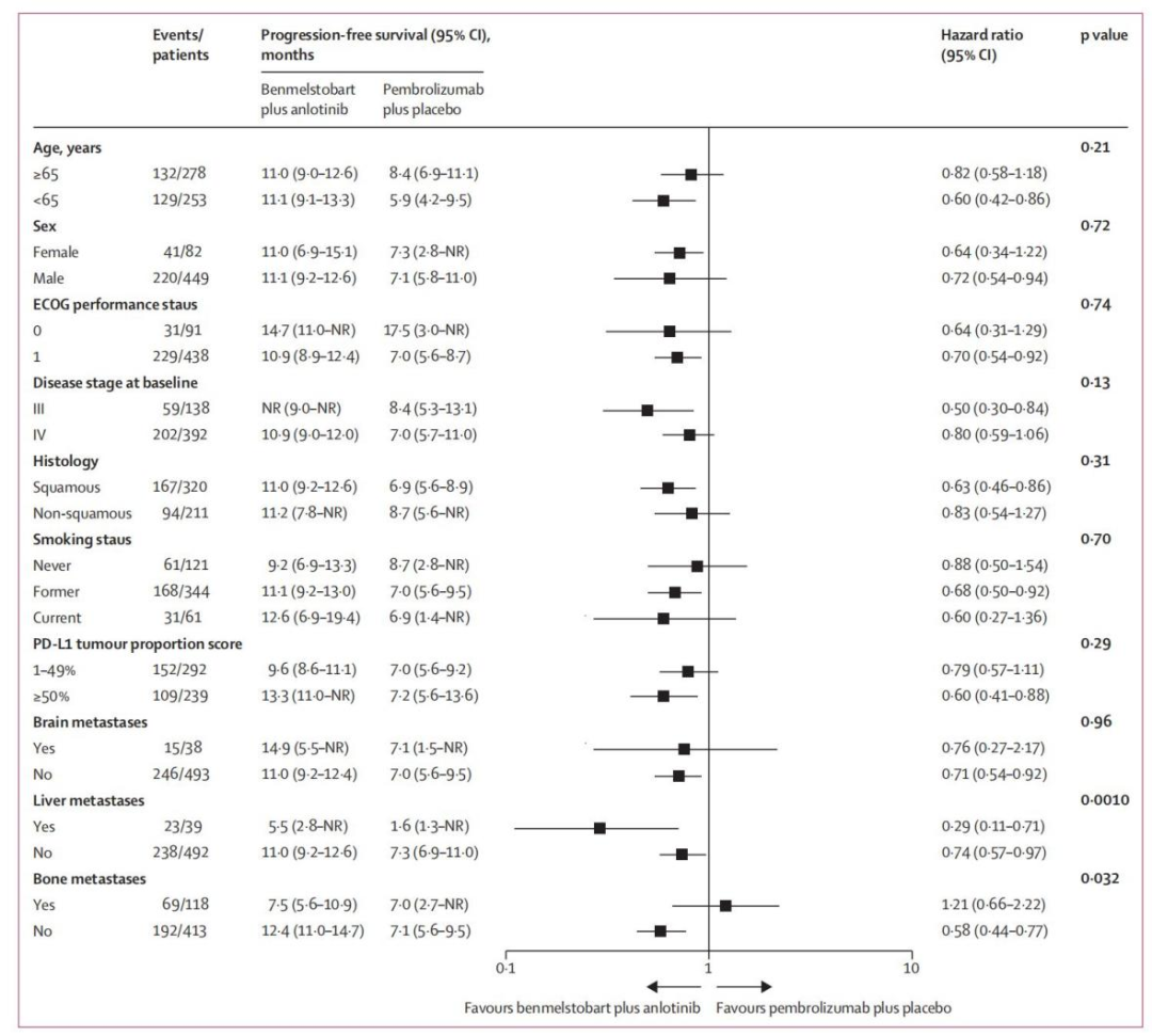 亚组分析显示,鳞癌患者两组中位PFS分别为11.0个月和6.9个月,HR=0.63,PD-L1≥50%的患者,两组中位PFS分别为13.3个月和7.2个月,HR=0.60,基线有肝转移的患者,两组中位PFS分别为5.5个月和1.6个月,HR=0.29,基线有脑转移的患者两组,中位PFS分别为14.9个月和7.1个月,HR=0.76。