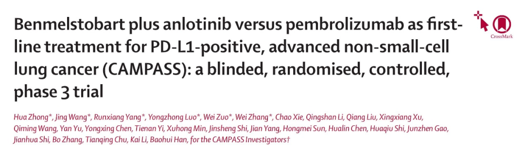 参考文献:Hua Z,Jing W,Runxiang Y,Yongzhong L,Wei Z,Wei Z,Chao X,Qingshan L,Qiang L,Xingxiang X,Qiming W,Yan Y,Yongxing C,Tienan Y,Xuhong M,Jinsheng S,Jian Y,Hongmei S,Hualin C,Huaqiu S,Junzhen G,Jianhua S,Bo Z,Tianqing C,Kai L,Baohui H,CAMPASS I,et al.Benmelstobart Plus Anlotinib Versus Pembrolizumab As First-Line Treatment for PD-L1-positive,Advanced Non-Small-cell Lung Cancer(CAMPASS):a Blinded,Randomised,Controlled,Phase 3 Trial.[J],The Lancet Oncology,2026