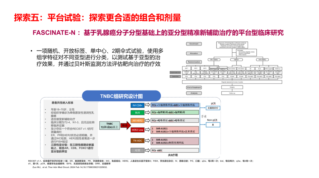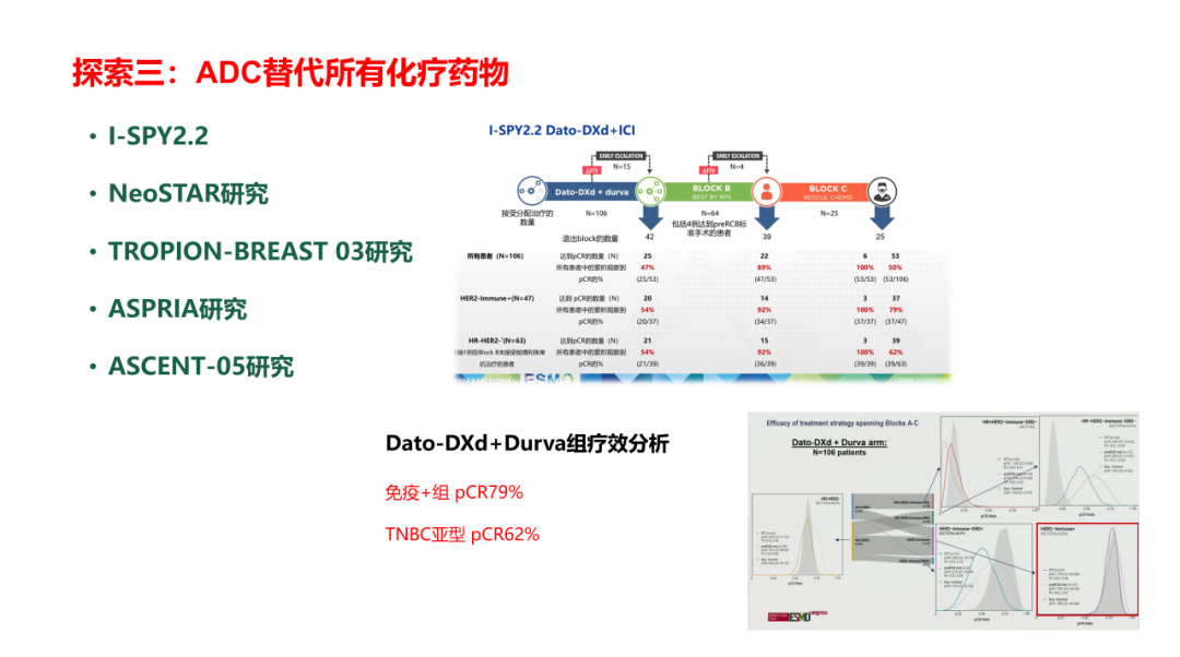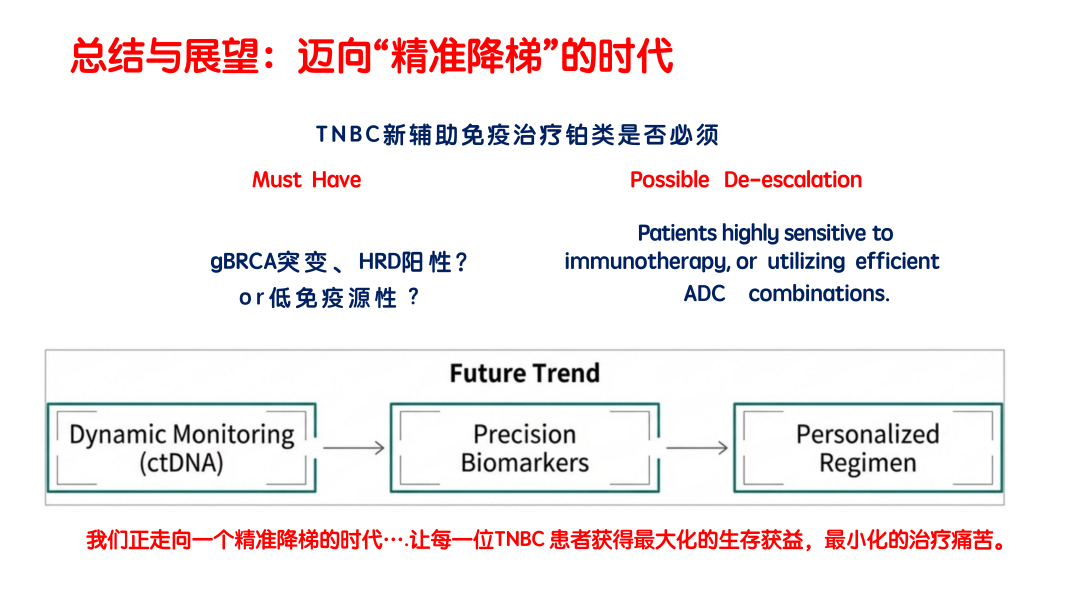 针对以上相关问题,我们目前也没有标准答案,未来如何破“铂类必须”的局?我们也只有不断进行求索。我梳理了一些临床的研究结果,从五个方面对以上问题进行回答:第一,去铂类留蒽环的尝试。目前为止,在三阴性乳腺癌新辅助化疗中,如果去铂类,相关临床研究应用的化疗药物都是留蒽环(如GeparNuevo研究、IMpassion031等)。第二,诱导免疫微环境后再去联合免疫检查点抑制剂(如BELLINI研究)。第三,ADC替代所有化疗药物,然后和免疫检查点抑制剂联合应用。如在BEGONIA研究中,Dato-DXd联合免疫检查点抑制剂1线治疗TNBC患者,ORR达到79%。第四,通过生物标志物筛选铂类适合人群(如gBRCAm患者)。第五,通过平台试验,探索更合适的组合和剂量(如复旦大学附属肿瘤医院基于乳腺癌分子分型基础上的亚分型精准新辅助治疗的平台型临床研究——FASCINATE-N)。希望今后能有更多的相关临床研究开展,使三阴性乳腺癌患者的治疗迈向精准“降阶梯”时代,让每一位三阴性乳腺癌患者都能获得最大化的生存获益,最小化的治疗痛苦。