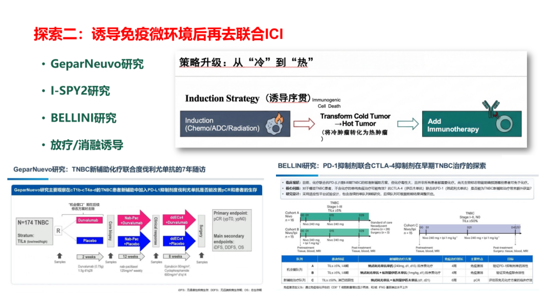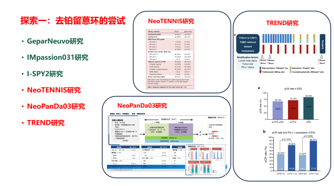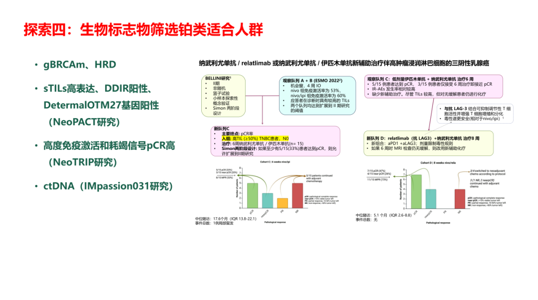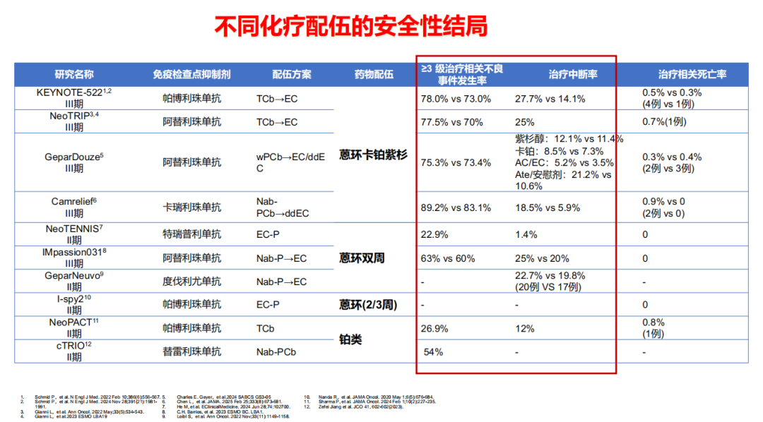 通过既往研究我们也看到,在不良反应方面,铂类联合化疗,其≥3级的相关不良事件都会有所增加,导致治疗中断率有所上升。但如果不使用铂类进行治疗,使用双周蒽环治疗方案(如IMpassion031研究),患者的pCR率也有所提升,但与此同时≥3级不良反应事件发生率、治疗中断率也有所增加。