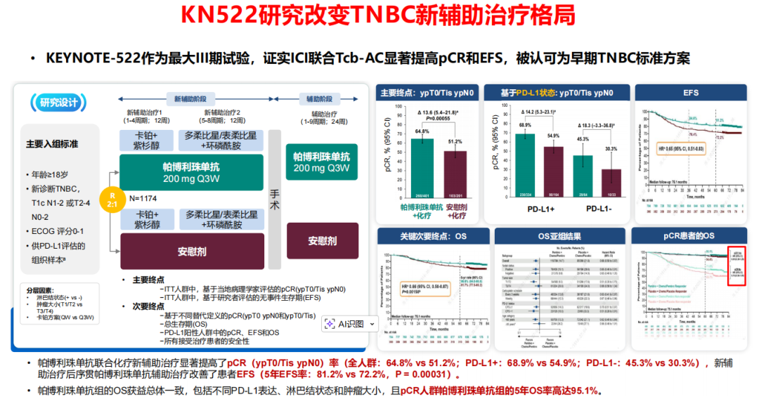 临床前的一些研究结果也证实,应用铂类药物后,患者的免疫浸润细胞会发生变化,从而使患者的免疫微环境从“冷”变“热”。因此,从机制上来讲,铂类与免疫治疗的联合应用,也能使患者得到更好的治疗效果。KEYNOTE-522研究很好地验证了这一联合机制治疗三阴性乳腺癌的疗效,其在新辅助治疗中给患者带来较好的EFS和OS的生存获益,可以说,KEYNOTE-522研究改变了三阴性乳腺癌新辅助治疗的格局。因此,到今天为止,我们很多困惑都来源于这一临床研究的设计。
