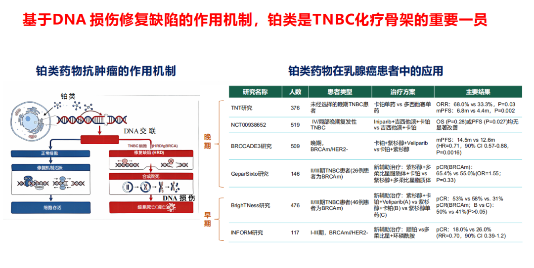 铂类抗癌药物属于细胞周期非特异性药物,主要通过进入肿瘤细胞后与DNA形成Pt-DNA加合物,从而阻碍细胞的复制,导致肿瘤细胞坏死或凋亡,进而产生抗癌效果。基于DNA损伤修复缺陷的作用机制,铂类是三阴性乳腺癌化疗骨架中的重要一员。在三阴性乳腺癌患者的临床应用当中,我们也看到了如BrighTNess、TNT等临床研究证实了铂类在新辅助和长期生存方面给患者带来了一定的获益。