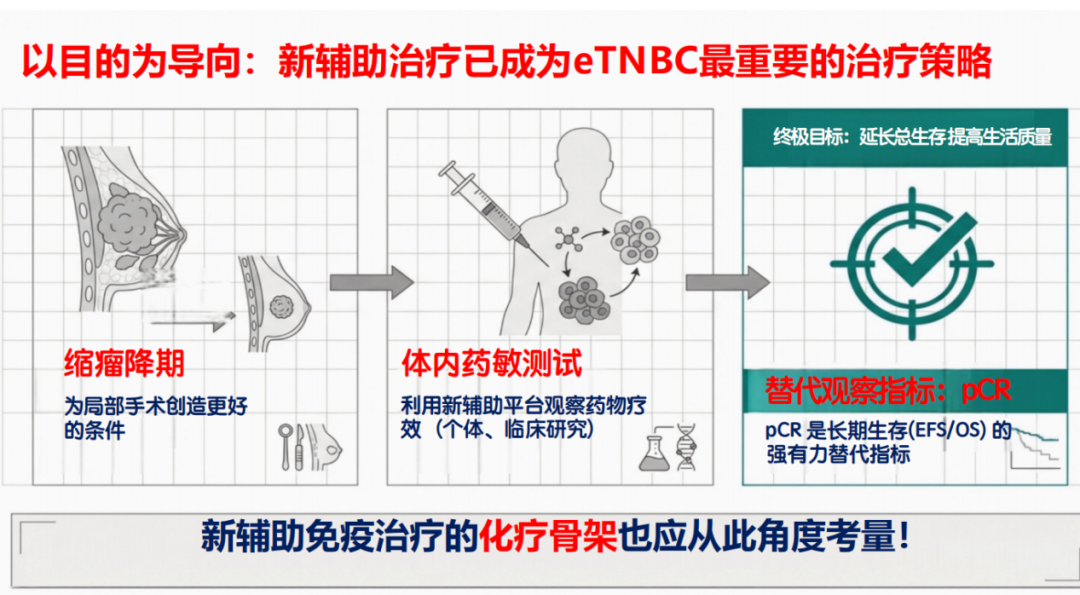 王嘉教授:新辅助免疫治疗时代,化疗是三阴性乳腺癌患者当前必须要接受的治疗。我认为,无论给出的这一话题题干是“去蒽环”还是“去铂类”,都是针对三阴性乳腺癌的新辅助化疗在做文章,我们也应以问题为导向,考虑这一问题的答案。三阴性乳腺癌新辅助治疗的目的有以下几方面:第一,缩瘤降期,为局部手术创造更好的条件;第二,体内药敏测试,利用新辅助治疗平台我们可以观察到患者体内的药敏情况,并利用其从个体和临床研究方面都给予后续的指导。最终目标是延长总生存,提高生活质量。其中pCR是长期生存(EFS/OS)的有力替代指标。因此,我们新辅助免疫治疗的化疗骨架也应从此角度进行考量。
