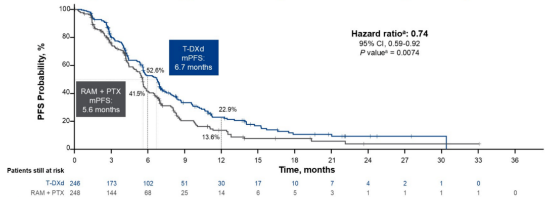在疾病缓解方面,T-DXd单药较RAM+PTX确认的ORR为44.3%vs.29.1%(P=0.0006),缓解持续时间(DOR)为7.4个月vs.5.3个月,意味着T-DXd较当前标准二线治疗方案具有更深、更持久的疾病缓解效果,能有效减轻患者疾病负担。