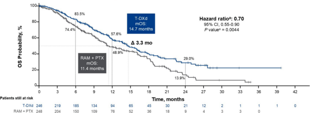 研究结果显示,T-DXd单药较RAM+PTX显著延长mOS,为14.7个月vs.11.4个月,降低了30%的死亡风险,(HR=0.70,95%CI:0.55-0.90,P=0.0044),各亚组在T-DXd治疗下更具优势,2年OS率实现翻倍,为29.0%vs.13.9%。T-DXd二线治疗不仅取得了当下最长的OS值,还使更大比例的患者有机会获得了长期生存获益。
