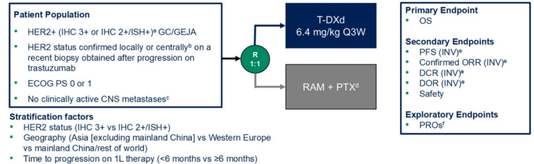 DESTINY-Gastric04研究纳入了494例既往接受过曲妥珠单抗联合化疗的HER2阳性(IHC 3+或IHC 2+/ISH+)局部晚期或转移性胃癌/胃食管结合部癌患者,所有患者均无活动性脑转移。其中,亚洲人群约占44%,中国大陆人群约占20%,约25%的患者在1线治疗6个月内进展,约15%的患者为免疫经治患者,约70%的患者存在≥2个转移灶,具有临床实践参考意义。患者按1:1随机分配至T-DXd治疗组或雷莫西尤单抗+紫杉醇(RAM+PTX)标准治疗组进行二线治疗。主要终点为OS,关键次要终点包括无进展生存期(PFS)、客观缓解率(ORR)等。