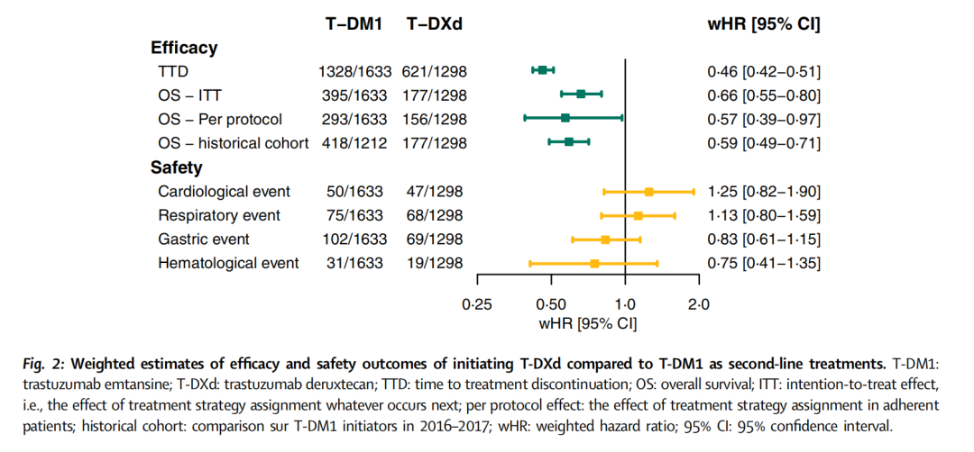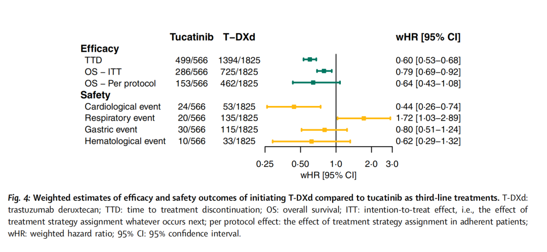 随访中,51.8%的图卡替尼起始患者转用了新型抗HER2 ADC,而新型抗HER2 ADC组有31.3%转用图卡替尼。在符合方案分析中,新型抗HER2 ADC相对于图卡替尼的死亡wHR为0.64。
