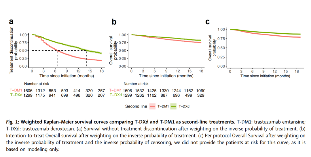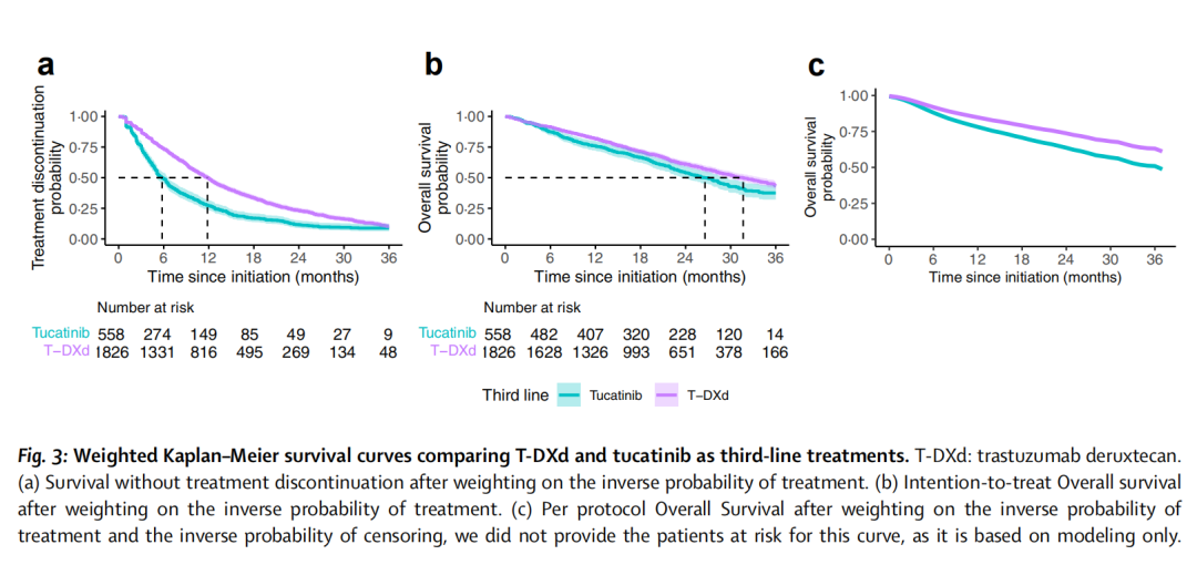 研究纳入了2020年9月30日至2023年9月30日期间起始上述治疗且既往无此类药物暴露史的患者,随访至患者死亡或2024年4月30日。其中,图卡替尼被假设为与曲妥珠单抗和卡培他滨联合使用,因为这是其在法国唯一获批报销的方案。二线治疗的最大随访时间为18个月,三线治疗为36个月。