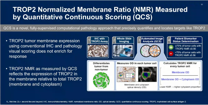 针对备受关注的TROP2 ADC,Fred Hirsch教授重点介绍了一项革命性的生物标志物分析技术——基于人工智能的定量连续评分(QCS)所衍生的标准化膜比值(NMR)。他解释道,传统免疫组化采用半定量H-score,仅评估总蛋白表达,而NMR通过深度学习算法,精准区分细胞膜表达与细胞质表达。“膜表达才是ADC发挥作用的关键。TROPION系列研究的回顾性分析显示,采用NMR评分后,患者的无进展生存期(PFS)获益被显著区分开来。”Fred Hirsch教授认为,这标志着生物标志物从“定性”向“定量”转变的重要一步,并期待TROPION-Lung17等前瞻性研究的最终验证。