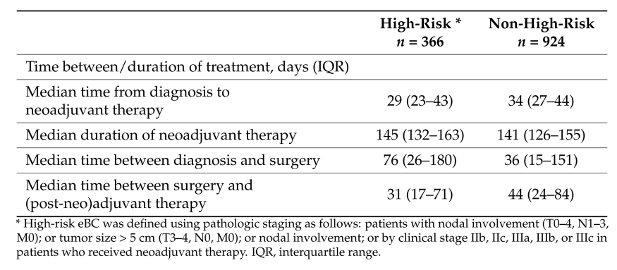 对于接受新辅助治疗的高危HER2+eBC患者,从诊断到开始新辅助治疗的中位时间为29天,略短于非高风险组的34天。新辅助治疗的中位持续时间在高风险组中为145天,也略长于非高风险组的141天。此外,在整体人群中,高风险组从诊断到手术的中位间隔时间相较于非高危组更长(76天vs 36天),这提示了其在新辅助阶段接受了更长时间的系统性治疗。