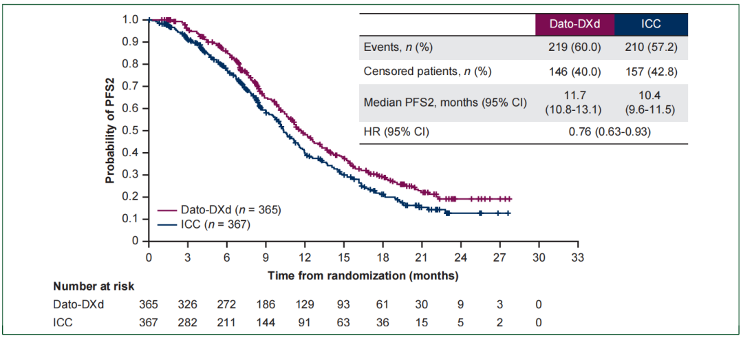 在中位随访22.8个月时,Dato-DXd组和ICC组分别发生了223例(61.1%)和213例(58.0%)死亡事件。Dato-DXd组的中位OS为18.6个月(95%CI 17.3-20.1),ICC组为18.3个月(95%CI 17.3-20.5),风险比(Hazard ratio,HR)为1.01(95%CI 0.83-1.22,P=0.9445)。Dato-DXd组6、12和18个月时的生存率分别为93.3%、74.2%和52.0%,而ICC组分别为87.9%、71.1%和50.9%[1]。