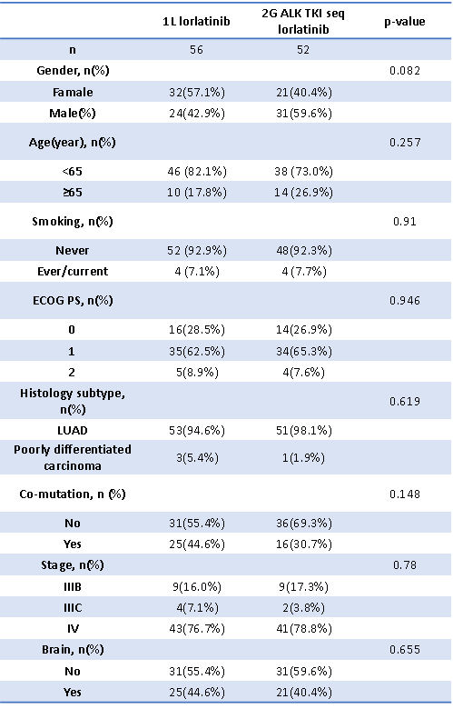 共纳入108例患者,其中一线洛拉替尼组56例,二代ALK-TKI续贯洛拉替尼组52例。基线脑转移比例分别为44.6%和40.4%。EML4-ALK变体主要包括V1和V3,并伴有一定比例的TP53共突变,整体基线特征均衡。
