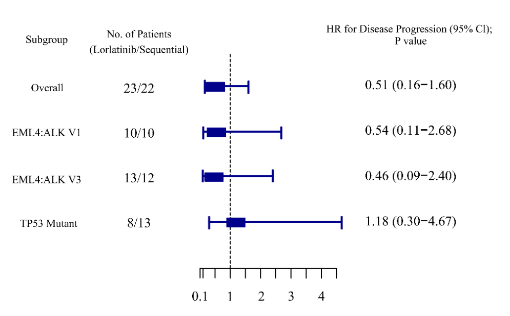 在EML4-ALK融合变异亚型中,EML4-ALK V1、V3等亚组均显示一线洛拉替尼在PFS上具有数值优势;TP53突变亚组因其置信区间较宽且中位PFS尚未达到,仍需要更大的样本量行进一步验证。