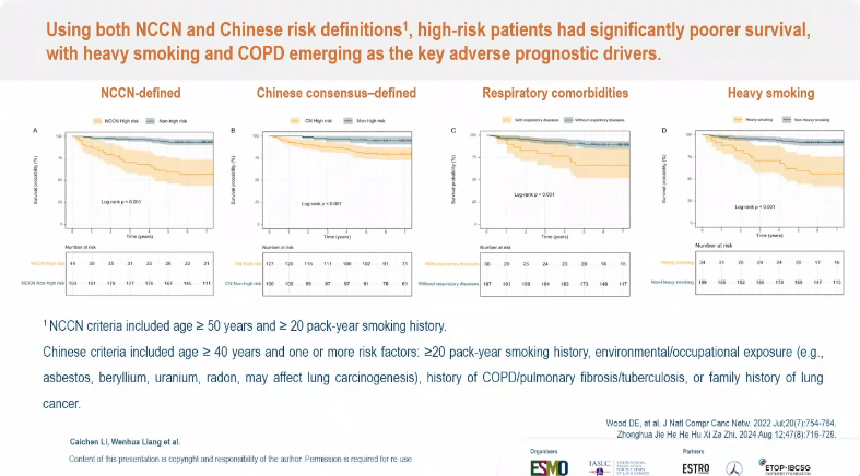 值得注意的是,在筛查组内,NCCN或中国指南定义的高危人群预后仍显著更差,重度吸烟史和慢性阻塞性肺疾病史同样与不良预后相关。