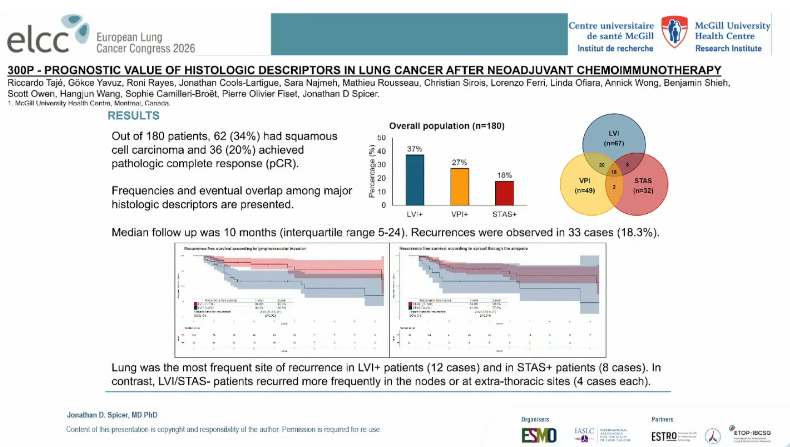 LVI的存在与更高的复发风险显著相关(HR 2.95,95%CI 1.45-6.01,p=0.003),STAS同样增加复发风险(HR 1.19,95%CI 1.19-5.31,p=0.016)。值得关注的是,LVI阳性患者最常复发部位为肺(12例),STAS阳性患者同样以肺为首发复发部位(8例),而LVI/STAS阴性患者则更多表现为淋巴结或胸外复发(各4例)。Jonathan Spicer教授指出,即使在pCR之外的残留肿瘤中,LVI和STAS这些传统病理指标仍具有明确的预后价值,应纳入术后病理评估体系,以更精准地分层复发风险、指导后续治疗决策。