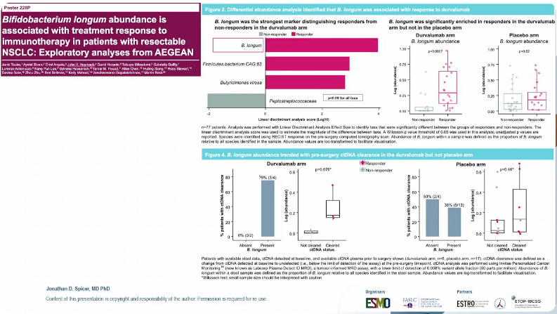 Jonathan Spicer教授特特别提到AEGEAN研究的微生物组探索性分析[10]。该研究对围术期度伐利尤单抗联合化疗的患者基线粪便样本进行宏基因组测序,发现长双歧杆菌(Bifidobacterium longum)丰度与治疗应答显著相关:在度伐利尤单抗组中,应答者B.longum丰度显著高于非应答者(p=0.0007),且B.longum丰度与残留活性肿瘤呈负相关(r=−0.5,p<0.02),而在安慰剂组中未见此关联。