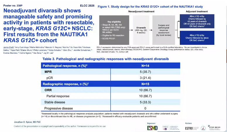 7.Yunpeng Yang,et al.Osimertinib(osi)with or without chemotherapy(CTx)as first-line treatment in EGFR-mutant(EGFRm)advanced NSCLC with concurrent TP53 mutations(TOP study).2026 ELCC.2O.8.Martin Reck,et al.Exploratory Analysis of Participants Without Pathological Complete Response(pCR)in the KEYNOTE-671 Study of Perioperative Pembrolizumab(Pembro)in Early-Stage NSCLC After 5 Years of Follow-Up.2026 ELCC.222MO.9.Margarita Majem,et al.Five-Year Outcomes of Participants With Pathological Complete Response(pCR)Enrolled in the KEYNOTE-671 Trial of Perioperative Pembrolizumab(Pembro)in Early-Stage NSCLC.2026 ELCC.223MO.10.John Heymach,et al.Bifidobacterium longum(B.longum)abundance is associated with treatment(Tx)response to immunotherapy(IO)in patients(pts)with resectable NSCLC(R-NSCLC):Exploratory analyses from AEGEAN.2026 ELCC.228P.11.Bo Cheng,et al.Aumolertinib for AI-predicted EGFR-mutated pulmonary ground-glass nodules:A single-arm,phase II,CATO-2301 trial.2026 ELCC.233P.12.Yang Y,et al.Sacituzumab tirumotecan(sac-TMT)in patients(pts)with previously treated advanced EGFR-mutated(EGFRm)non-small cell lung cancer(NSCLC):Final overall survival(OS)analysis from the randomized OptiTROP-Lung03 study.ELCC 2026.LBA4.13.Wu Y,et al.SHR-A2009,a HER3-targeted ADC,plus aumolertinib(A)as 1L or≥2L treatment for EGFR-mutated(EGFRm)NSCLC:A phase Ib/II study.2026 ELCC.10MO.14.Zhang L,et al.Becotarug(JMT101)and osimertinib(Osi)in patients(pts)with platinum-pretreated EGFR exon 20 insertion-mutated(ex20ins)non-small cell lung cancer(NSCLC):Final overall survival(OS)and subgroup analyses from the BECOME phase II study.2026 ELCC,7MO.15.Jarushka Naidoo,et al.Phase II ETOP ADEPPT trial:Adagrasib in patients with KRASG12C-mutant NSCLC who are elderly or have poor performance status-Final results.2026 ELCC,5MO.16.Adrian G.Sacher,et al.Updated results for MK-1084+pembrolizumab in KRAS G12C-mutated(mut)metastatic non-small cell lung cancer(mNSCLC)enrolled in KANDLELIT-001.2026 ELCC,4MO.17.Philippe CASSIER,et al.Efficacy and safety of setidegrasib in patients(pts)with advanced NSCLC with KRAS G12D mutation.2026 ELCC,1O.18.Benjamin Besse,et al.Ceralasertib(C)+durvalumab(D)in patients(pts)with locally advanced(LA)or metastatic(m)NSCLC who progressed on or after anti-PD-(L)1 and platinum-based chemotherapy(CT):Results from LATIFY.2026 ELCC,LBA1.19.Kai He,et al.Anti-tumor activity of gotistobart compared to docetaxel in patients with metastatic squamous non-small cell lung cancer(sqNSCLC)progressing on PD-(L)1 inhibitors:Stage 1 PRESERVE-003 phase III trial.2026 ELCC,3O.20.Jacob Sands,et al.TROPION-Lung17:A randomised phase III study of datopotamab deruxtecan(Dato-DXd)vs docetaxel in patients with previously-treated TROP2 NMR positive advanced/metastatic non-squamous non-small cell lung cancer(NSCLC)without actionable genomic alterations(AGA).2026 ELCC,145TiP.21.Solange Peters,et al.ETOP-Roche i-TIMES:Immunotherapy timing investigation on lung cancer survival.2026 ELCC,LBA2.22.Fei Zhou,et al.Phase II Study of iza-bren(BL-B01D1)in Combination with Serplulimab in Patients with Small Cell Lung Cancer(SCLC).2026 ELCC,408O.23.Julien Mazieres,et al.A phase I dose escalation trial of obrixtamig+ezabenlimab in patients(pts)with small cell lung cancer(SCLC)or other neuroendocrine carcinomas(NECs)expressing DLL3.2026 ELCC,409O.24.Ippokratis Korantzis,et al.DeLLphi-312 phase III trial-in-progress:Tarlatamab with durvalumab,carboplatin and etoposide versus durvalumab,carboplatin and etoposide as first-line(1L)therapy in extensive-stage small cell lung cancer(ES-SCLC).2026 ELCC,442TiP.25.Gökce Yavuz,et al.Pathological nodal response after neoadjuvant chemoimmunotherapy in resectable NSCLC.2026 ELCC,298P.26.Riccardo Tajè,et al.Prognostic value of histologic descriptors in lung cancer after neoadjuvant chemoimmunotherapy.2026 ELCC,300P.27.Ippokratis Korantzis,et al.Neoadjuvant divarasib shows manageable safety and promising activity in patients with resectable,early-stage,KRAS G12C+NSCLC:First results from the NAUTIKA1 KRAS G12C+cohort.2026 ELCC,238P.28.Haifeng Liu,et al.First disclosure of efficacy and safety data for YL202/BNT326(HER3 ADC)from a phase II trial in patients(pts)with non-small cell lung cancer(NSCLC).2026 ELCC,11MO.
