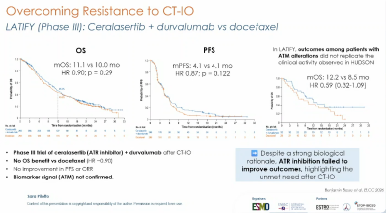 LATIFY研究(摘要号:LBA1):在非驱动基因依赖NSCLC领域,Sara Pilotto教授重点解读了两项III期研究。由法国古斯塔夫·鲁西研究所Benjamin Besse教授报告的LATIFY试验评估了ATR抑制剂ceralasertib联合度伐利尤单抗在免疫化疗经治患者中的疗效,但未达主要终点(OS HR 0.90,p=0.287),未重复II期研究中的阳性信号[18]。