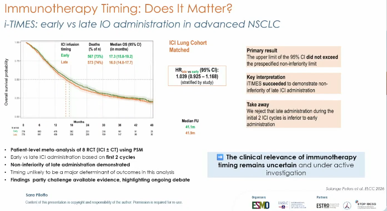 ETOP-Roche i-TIMES荟萃分析(摘要号:LBA2):Sara Pilotto教授还特别提及了ETOP-Roche i-TIMES荟萃分析结果,该研究纳入8项国际随机对照试验共3165例肺癌患者,通过倾向评分匹配分析免疫治疗在前两个周期中“早用”(中午12时前)与“晚用”对总生存期的影响。结果显示,晚用组未能达到非劣效性边界(HR 1.104,95%CI 0.984-1.238),提示免疫治疗的首次给药时间可能影响远期生存,这一发现挑战了既往认知,值得进一步验证[21]。