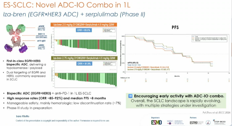 BL-B01D1联合serplulimab(摘要号:408O):在小细胞肺癌领域,Pilotto教授重点介绍了BL-B01D1(EGFR/HER3双抗ADC)联合serplulimab在初治广泛期SCLC中的II期研究。结果显示,ORR达88.3%,中位PFS为8.2个月,12个月OS率达80.8%。尽管血液学毒性常见,但停药率低(7.3%),显示出该去化疗方案在SCLC一线治疗中的巨大潜力[22]。