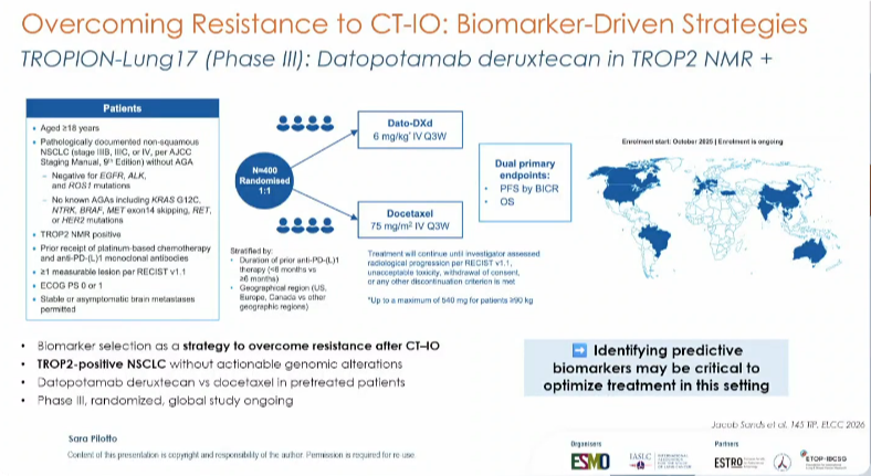 TROPION-Lung17研究(摘要号:145TiP):该正在探索Dato-DXd在TROP2 NMR阳性、非鳞、无驱动基因、免疫经治患者中相较于多西他赛的疗效,体现了通过生物标志物筛选ADC获益人群的精准理念[20]。