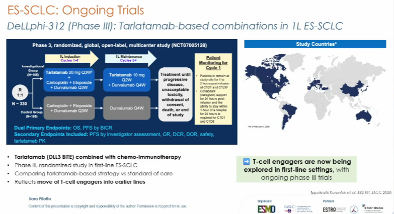 DeLLphi-312研究(摘要号:442TiP):该研究正在探索tarlatamab联合度伐利尤单抗+化疗在广泛期SCLC一线治疗中的价值,进一步拓展了T细胞衔接器在SCLC领域的前景[24]。